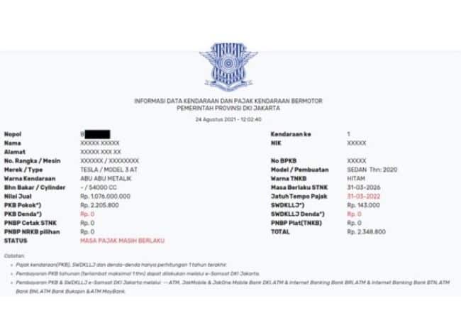 Sebagai contoh data di atas yang mana mobil tesla ini yang di buat tahun 2020 memiliki pokok pajak kendaraan bermotor PKB Rp 2.203.800 berbanding terbalik dengan harga nya bisa hampir mencapai di angka 2 Miliar.