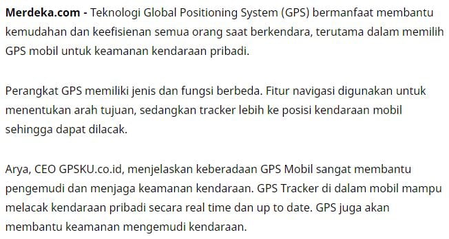 GPSKU menjadi trend setter penyedia Gps tracker di indonesia, Selain harga gpsnya yang pasti murah, memiliki kemampuan server yang handal, apalagi aplikasi GPSKU unik, lain dari biasanya. perusahaan ini mendapatkan ulasan dari beberapa media nasional seperti : Liputan6.com, Merdeka, Viva.Co.id , Sindonews dan ikut serta para blogger otomotif yang sudah banyak dikenal